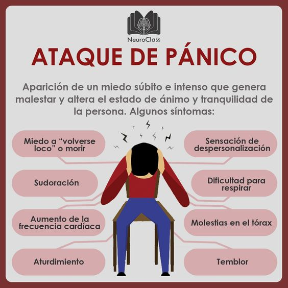 Aunque no todas las personas lo experimentan igual, los síntomas más comunes son palpitaciones, sudoración, temblor de manos, flojedad de piernas, náuseas, molestias abdominales, mareos, dolor de cabeza, opresión en el pecho, sensación de ahogo y sofocación.